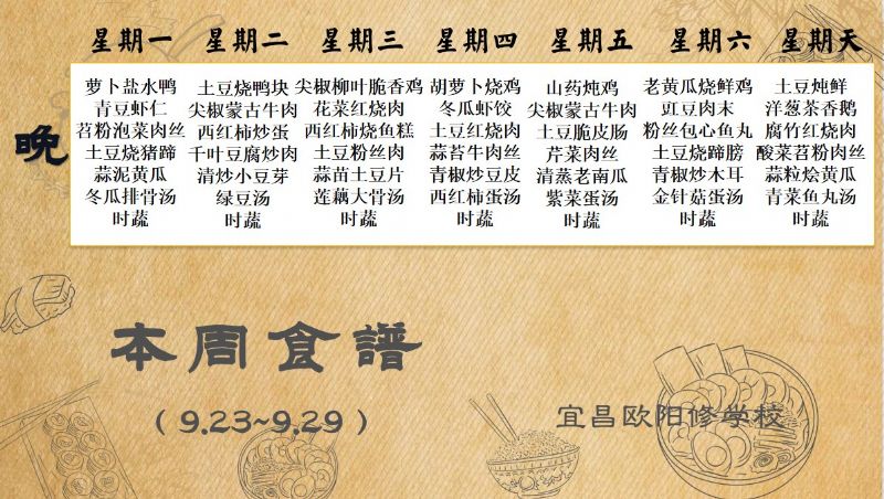 宜昌欧阳修学校每周食谱(9月23日至9月30日)