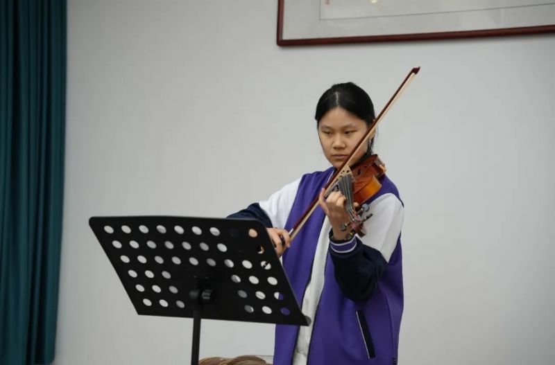 座谈间隙,学生们的精彩表演让现场温情再升级:206班卢雨萱的古筝独奏《春江花月夜》,弦音袅袅、古韵悠长;207班谭力的独唱《心中的日月》,歌声清澈、满含敬意;208班刘彩雯的小提琴独奏《月半小夜曲》,旋律流转、祝福暗藏。孩子们专注的神情、真挚的情感,赢得老教师们阵阵掌声。