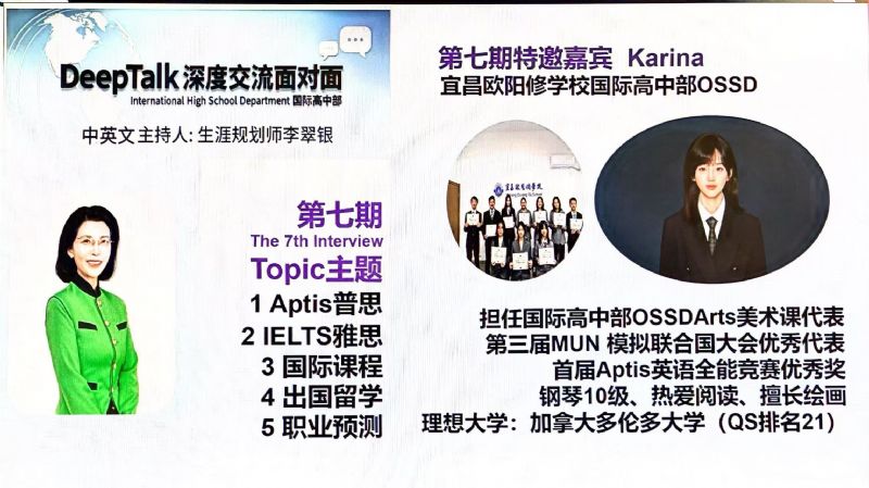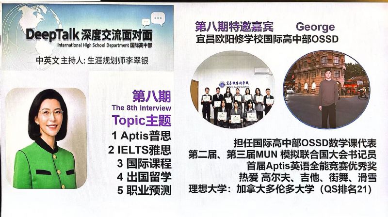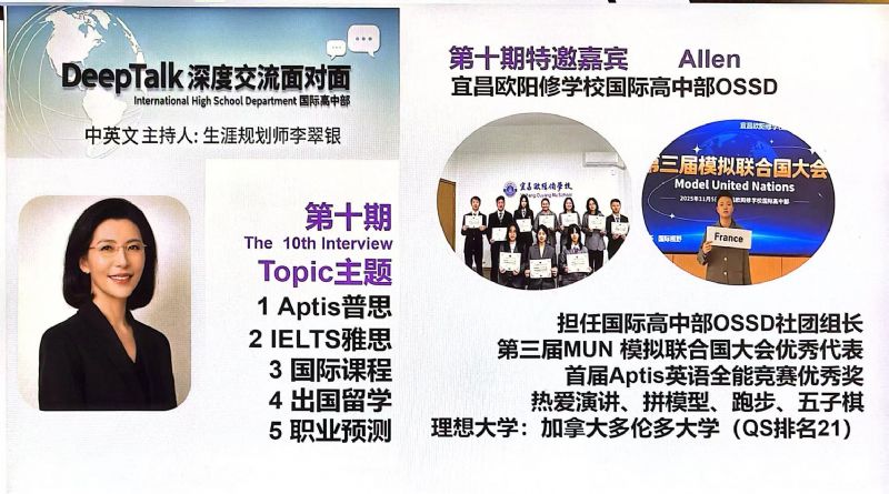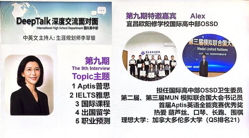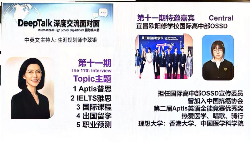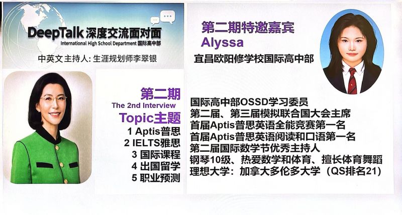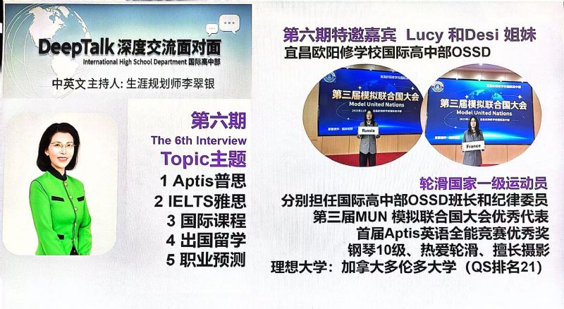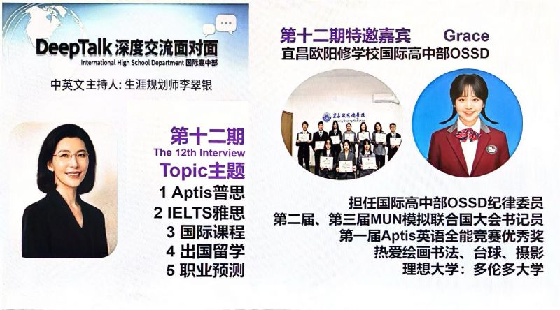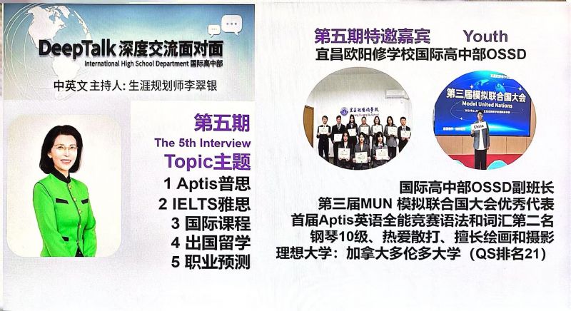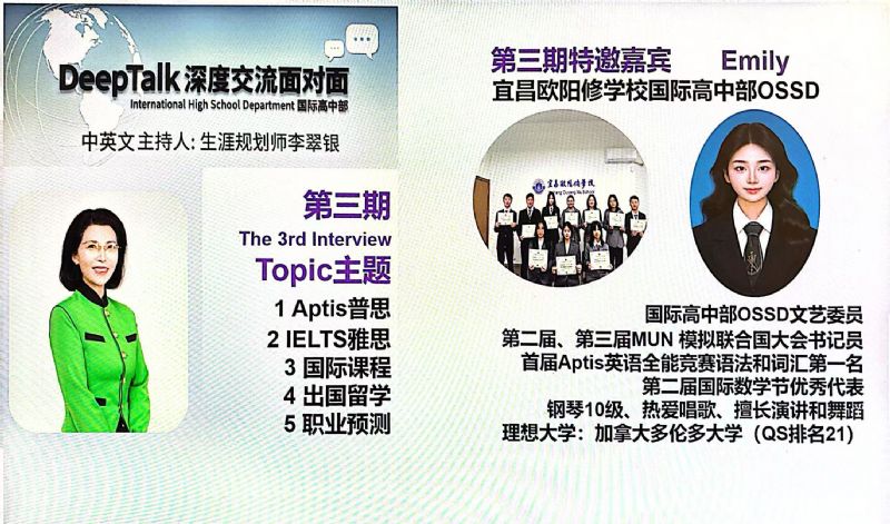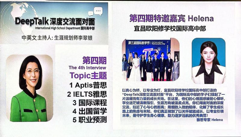 为什么要搭建DeepTalk这个平台? 因为国际高中部的学生面临着国际标化考试、出国留学、文化融入以及自我认知的多重挑战,为了切中家长和学生的刚需,确保学生身心健康地成长,宜昌欧阳修学校国际高中部,经过总结多年的教育教学经验,决定于2023年9月正式为学生搭建一个集心理支持、学业规划和生涯指导于一体的平台:DeepTalk深度交流面对面。